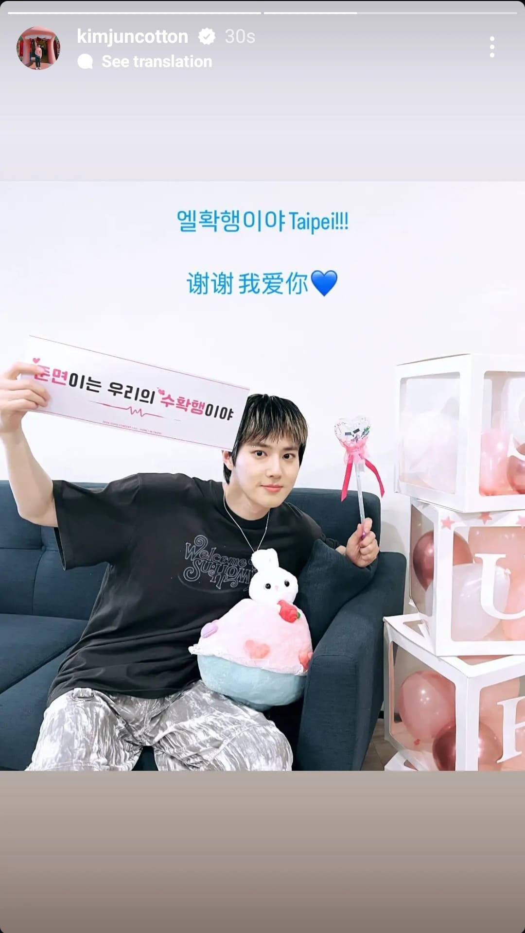 SUHO:這次真的是久違的來到台北,然後舉辦了 SUHO 的 solo 演唱會,這個瞬間我等了好久。SUHO:大家,你們哭的話我都看得很清楚喔~不要哭喔~(不要哭)因為這樣的話我也會哭(我會哭,所以 不要哭)。
